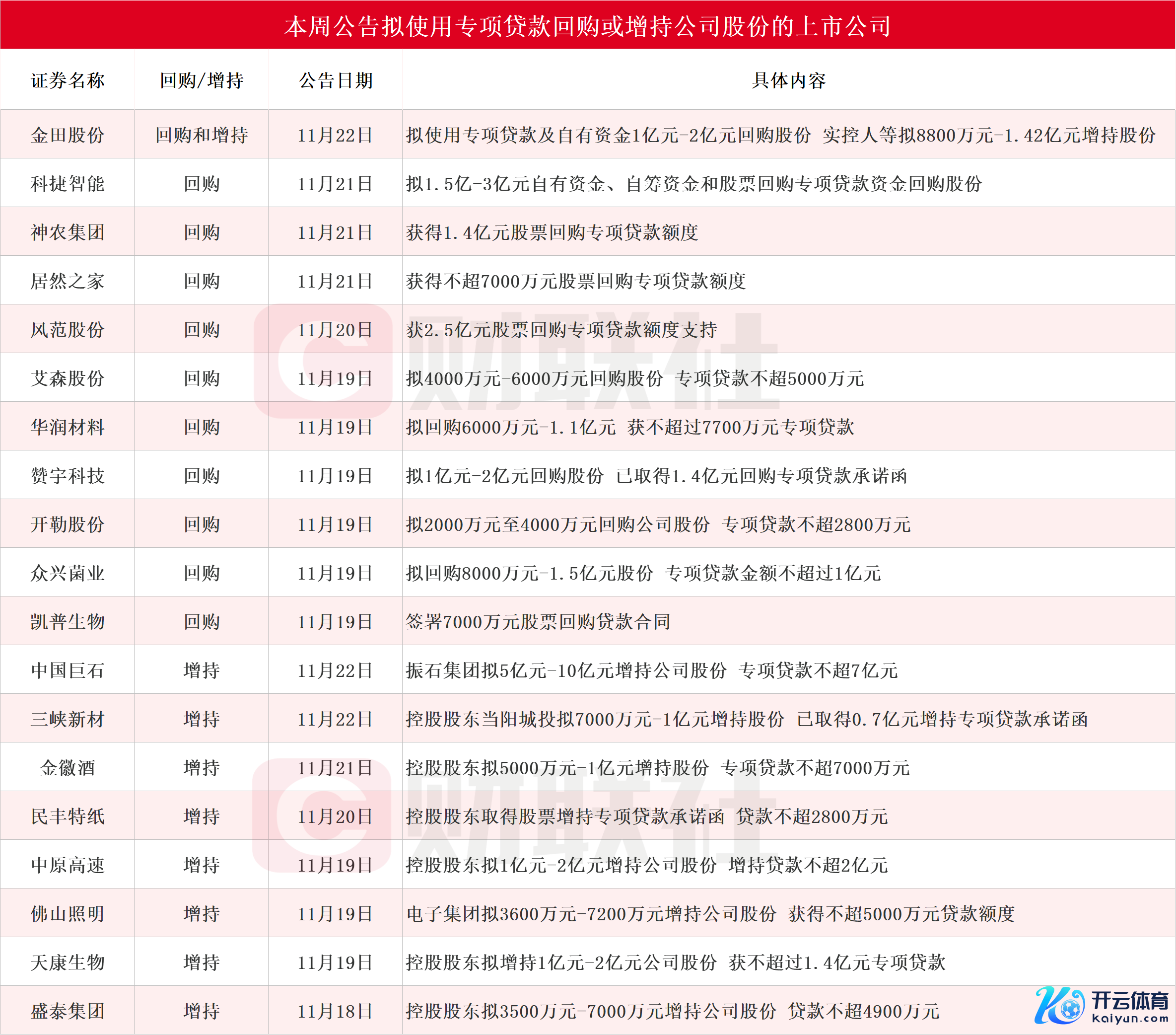 据不系数统计体育游戏app平台,完结发稿,本周(11月18日-11月24日)包括金田股份、科捷智能、神农集团、的确之家、风度股份、艾森股份、华润材料、赞宇科技、开勒股份、众兴菌业、凯普生物、中国巨石、三峡新材、金徽酒、民丰特纸、华夏高速、佛山照明、天康生物和盛泰集团在内的19家上市公司袒露回购增握再贷款讨论情况。其中,中国巨石公告,激动振石集团拟5亿元-10亿元增握公司股份体育游戏app平台,专项贷款不超7亿元。