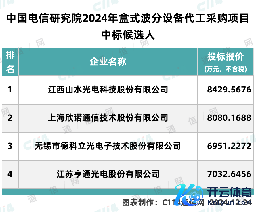 C114讯 12月24日音问(水易)来自中国电信(601728)阳光采购网音问,中国电信磋磨院2024年盒式波分成就代工采购方法已完成评审,评审适度如下: